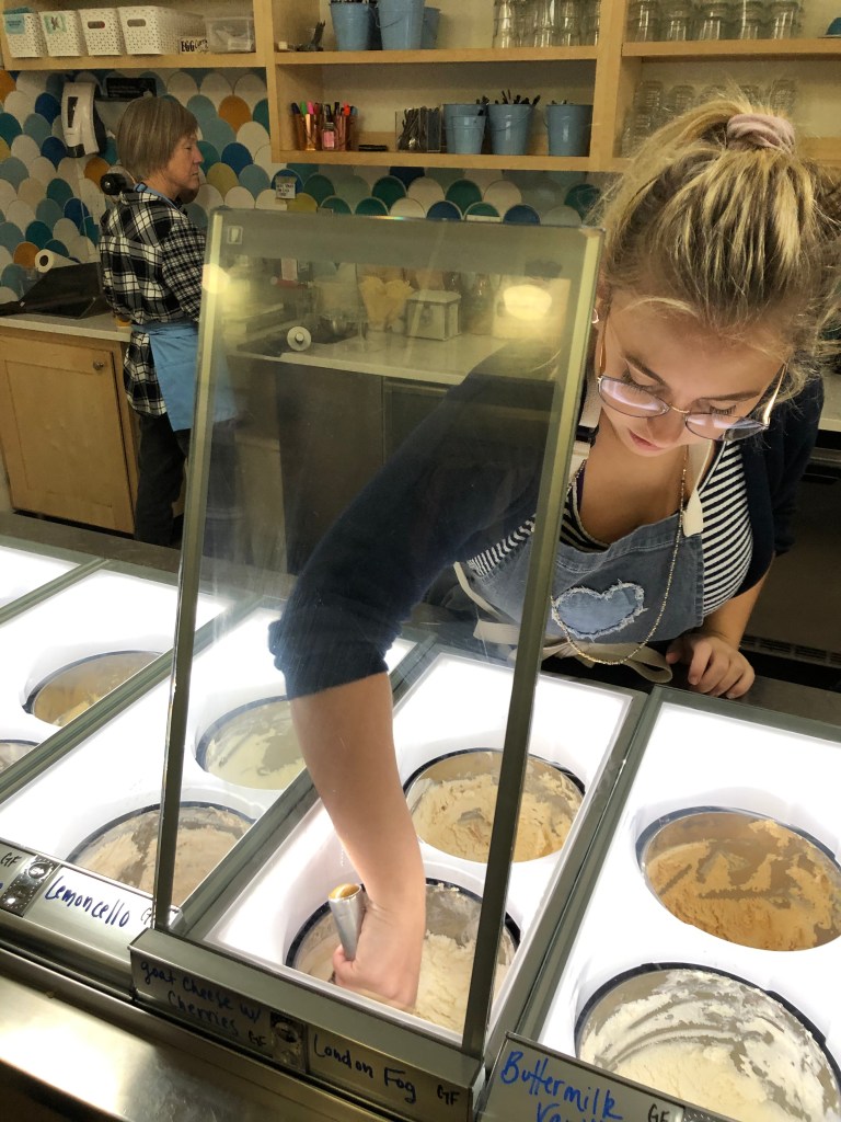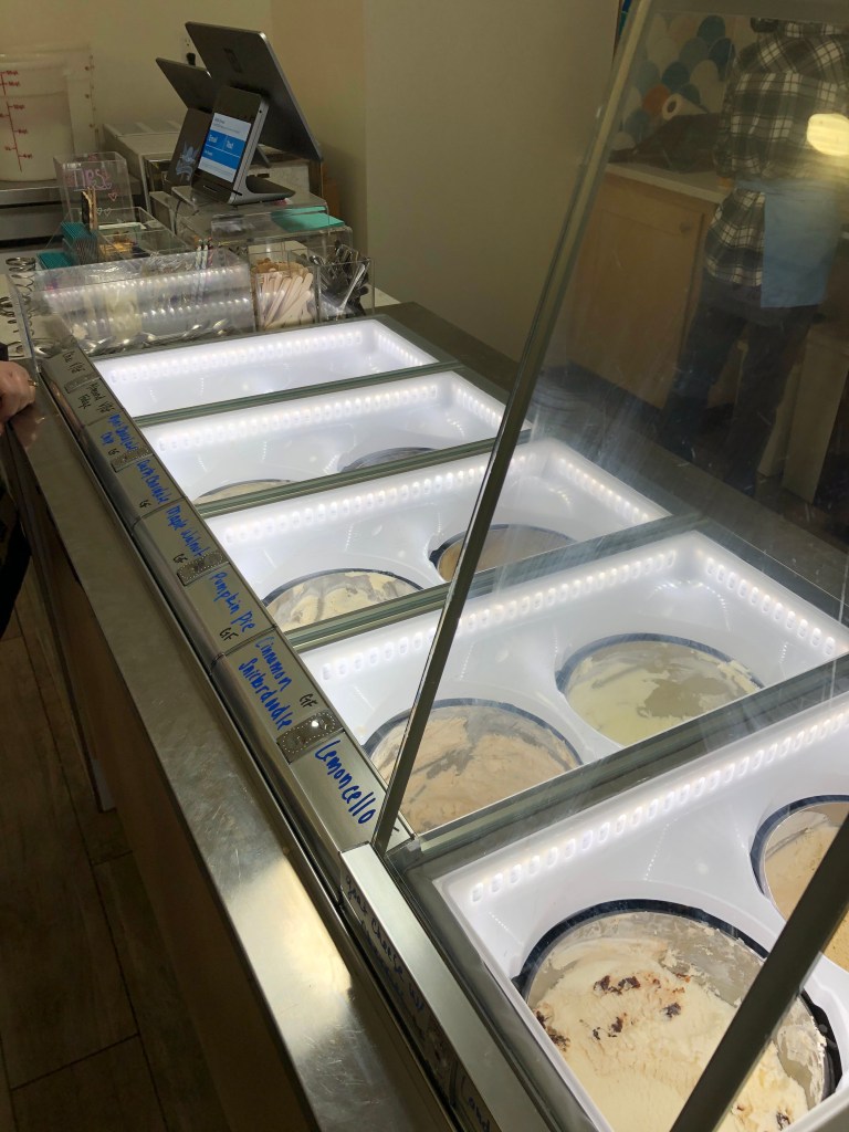 All ice cream and sorbets are made in small batches using local ingredients. They offer vegan options and most flavors are gluten free. All ice cream is made onsite! Not to mention, handcrafted flavors change with the season. Some staples stay around like mint chocolate chip, vanilla, and chocolate.